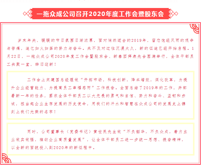 一拖眾成公司召開(kāi)2020年度工作會(huì)暨股東會(huì)、新春團(tuán)拜表先會(huì)